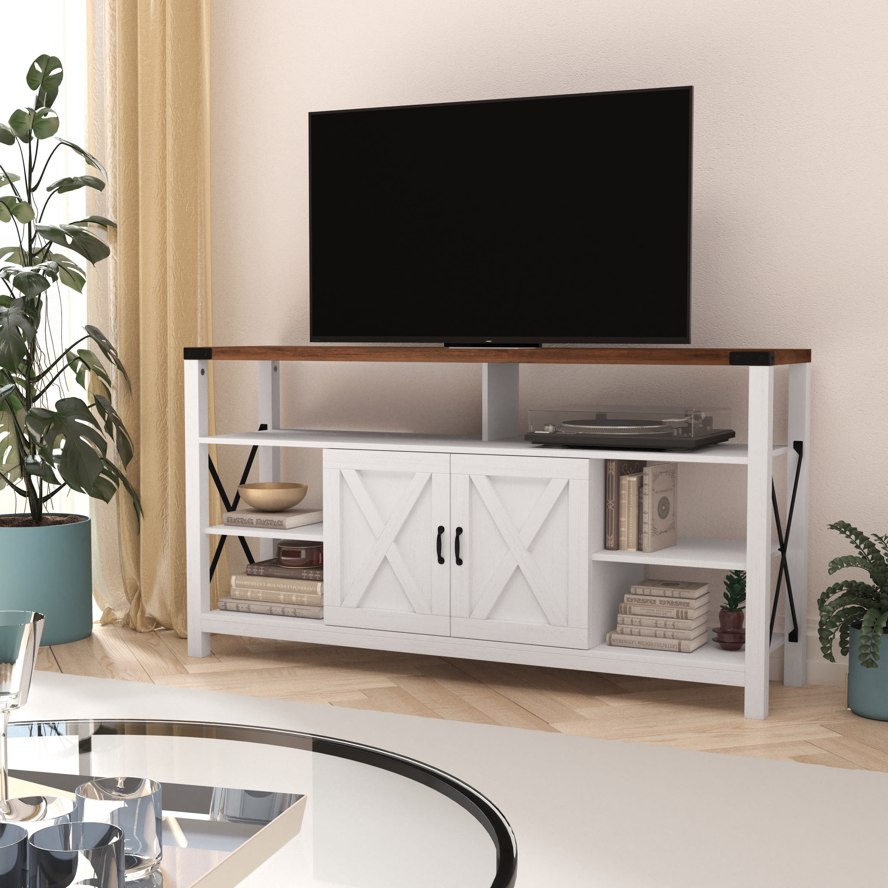 Merrick Lane 60 Media Console In White With Rustic Oak Top For 55 Inch Tv S With Open And Closed Storage Walmart Com